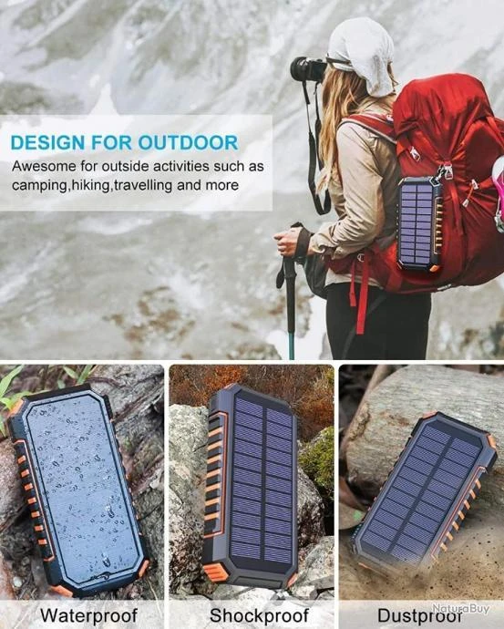 Cette banque d’alimentation est utilisĂ©e pour charger vos appareils Ă l’extĂ©rieur. La capacitĂ© de 26800 mAh et 3 sorties USB prennent facilement en charge votre voyage de randonnĂ©e de 10 jours. Il dispose d’un panneau solaire intĂ©grĂ© pour utiliser l’Ă©nergie du soleil et de 60 LED lumineuses (Standard Strong SOS Strobe) pour une source de lumiĂšre fiable en camping ou en cas de panne de courant. Commencez votre prochaine aventure avec ce chargeur solaire et ne vous inquiĂ©tez plus jamais de la batterie dĂ©chargĂ©e!