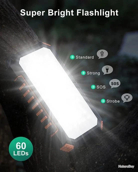 60 LED Lumineuses: les 60 LED lumineuses Ă l’arriĂšre du chargeur sont un outil pratique pour vos aventures en plein air. Elles peuvent ĂȘtre allumĂ©es en maintenant le bouton d’alimentation enfoncĂ© pendant 3 secondes, permettant aussi de passer d’un mode Ă l’autre.