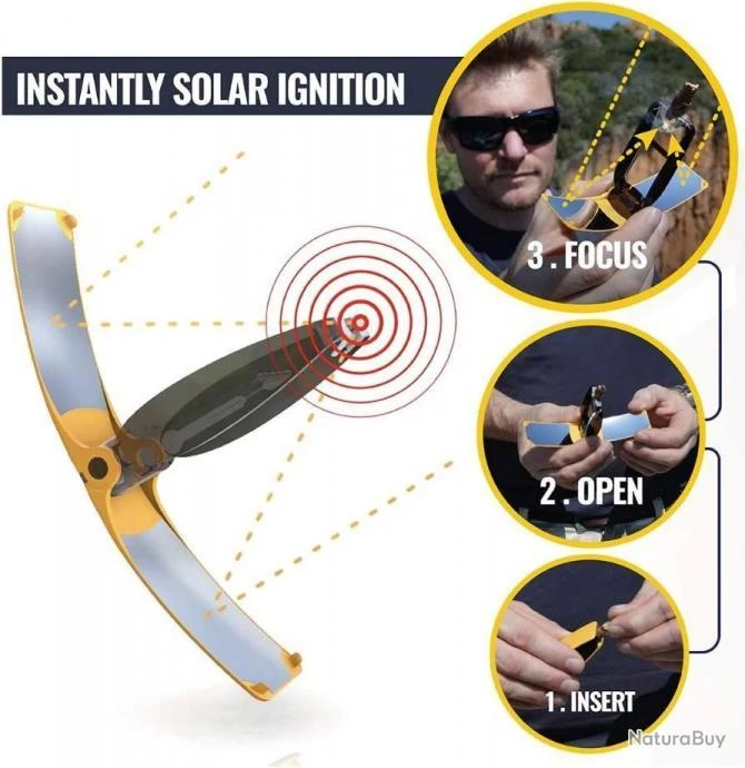 UN BRIQUET SOLAIRE INGÉNIEUX ET INNOVANT : Grâce à ses miroirs paraboliques, le briquet concentre les rayons solaires en un seul point pour un allumage en 3 secondes tout en restant un objet très compact et léger.