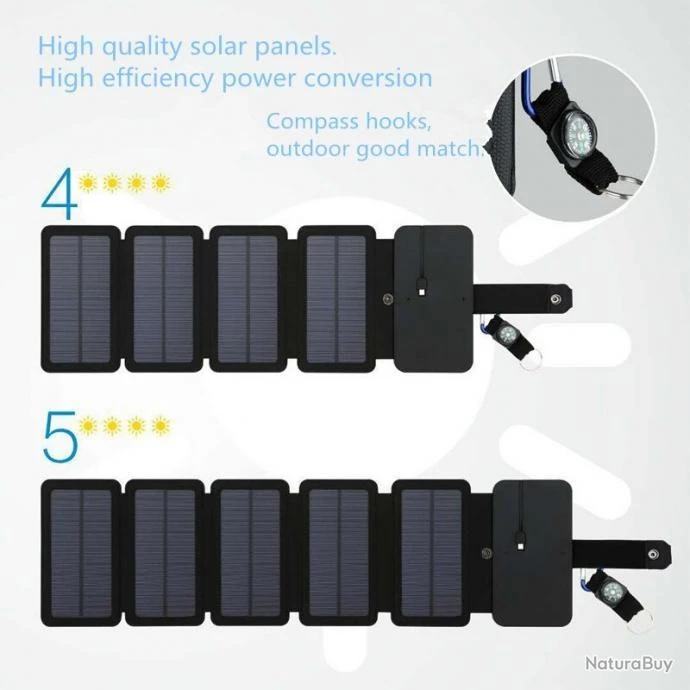 Chargeur Solaire Pliant pour Smartphone , Tablettes, GPS PowerBank Taille: 155x76x26mm, Deplie 530mm Leger , Compact ,Waterproof Ideal pour toutes les activites exterieures Randonnee Camping Peche Au Choix 4 Panneaux 16W 5 Panneaux 20W Sortie USB: 5V/2.1A LIVRAISON GRATUITE ENV 2/3 Semaines