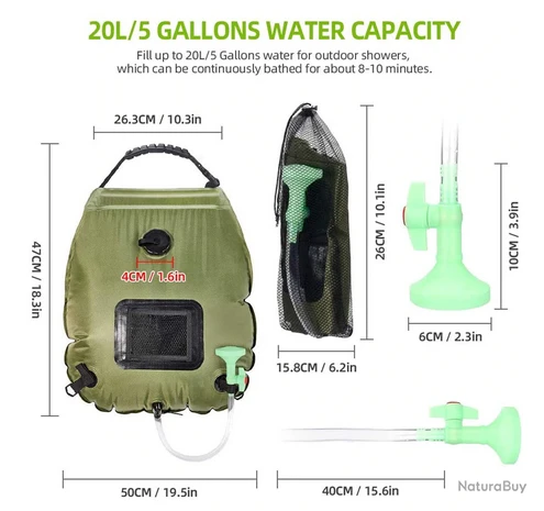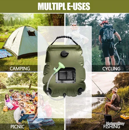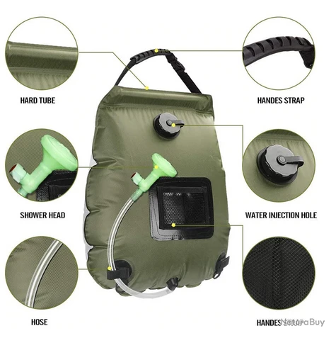 Chauffage à économie d’énergie solaire: ce sac de douche de camping solaire est fabriqué en matériau PVC écologique et étanche, non toxique, sain et sûr pour les personnes. Avec le revêtement thermocollant UV, il peut chauffer l’eau pendant environ 3 heures sous la lumière directe du soleil, aucun besoin de n’importe quel dispositif.
