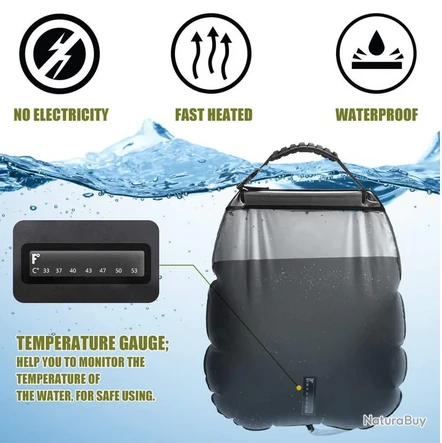 L’indicateur de température (° c/° f) à l’arrière du sac de douche solaire peut vous aider à surveiller la température de l’eau, Vous n’avez donc pas besoin de deviner la température de l’eau.