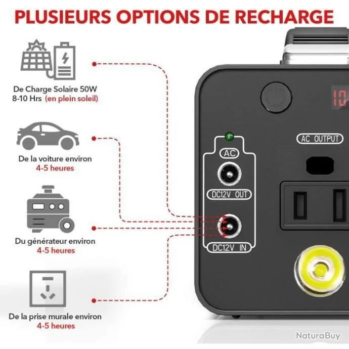 Méthode de charge : Panneau solaire (non inclus) – prise murale – chargeur de voiture