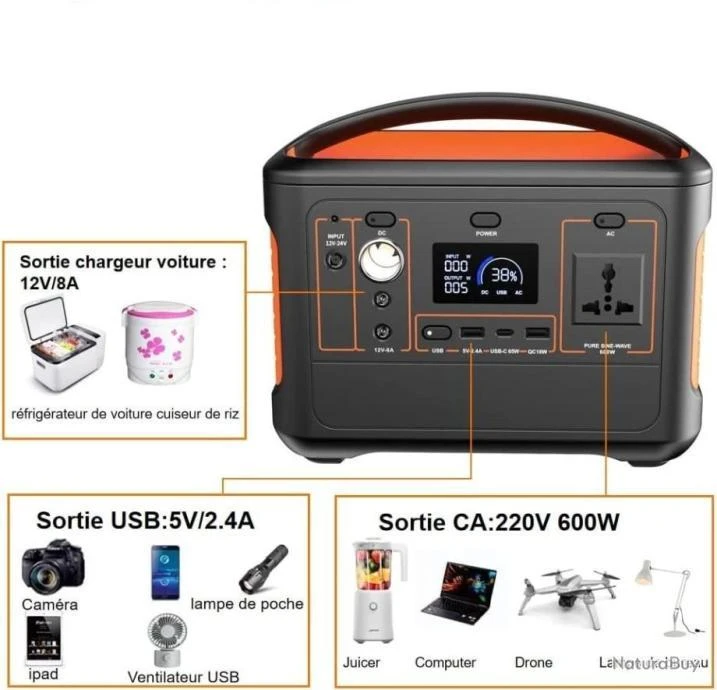 Tension et courant de sortie : AC 100V/110V/220V 60/50Hz 600±10W USB DC 5V/2.4A QC3.0 18W TYPE-C 65W SORTIE 12V/8A