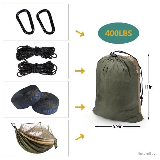 Hamac avec moustiquaire, 260cm x 140cm, 2 sangles d’attache de 2m.