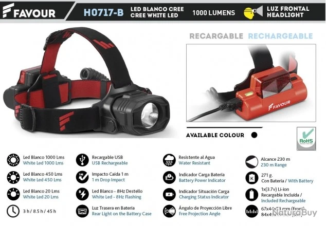 Lampe frontale rechargeable. 1000 lm. No