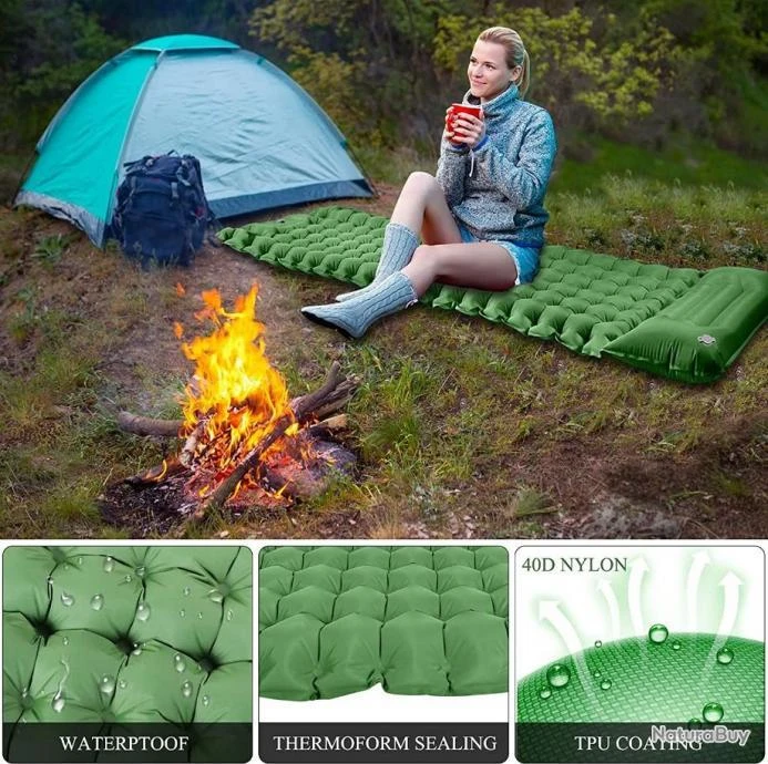 4.0″ TICKNESS & COMFORTABLE PLUS: Fabriqué en TPU de qualité supérieure et en nylon ripstop pour empêcher l’air de fuir et imperméable; Le tapis de camping élargi et épaissi dispose d’une hauteur de 10cm/4 pouces après le gonflage pour isoler la froideur du sol; Préservation de la chaleur élevée Capacité; Nylon 40D robuste (Etanche et résistant à l’humidité), le tout pour une bonne nuit de sommeil pour n’importe quelle position de sommeil, n’importe où et à tout moment!