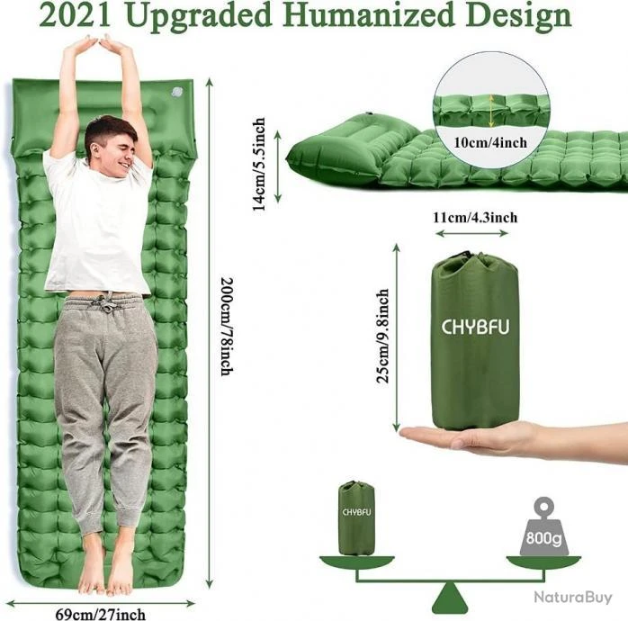 CONCEPTION AMÉLIORÉE DE LARGEUR ET D’ÉPAISSEUR SUPPLÉMENTAIRE: Le coussin de couchage amélioré CHYBFU 2021 améliore non seulement la technologie de gonflage, il permet également de réduire le travail de la pompe à pied et, en même temps, nous avons élargi le tapis de couchage, largeur 69cm/27 pouces et épaisseur 10cm/4 pouces rend ce matelas de camping plus large et plus épais que la plupart des tapis de couchage sur le marché!