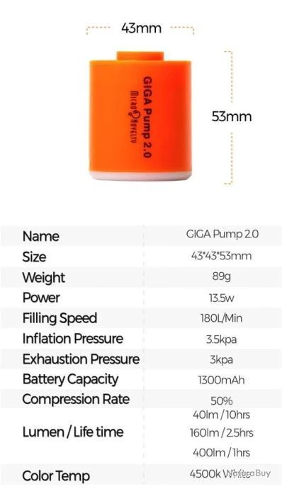 Le débit de la pompe GIGA 2.0 peut atteindre 180 l/min et la pression peut atteindre 3.5KPa. C’est l’outil parfait à emporter avec vous lorsque vous allez à la plage en été ; Il peut rapidement gonfler votre tube de natation, votre matelas pneumatique et tout autre outil gonflable.