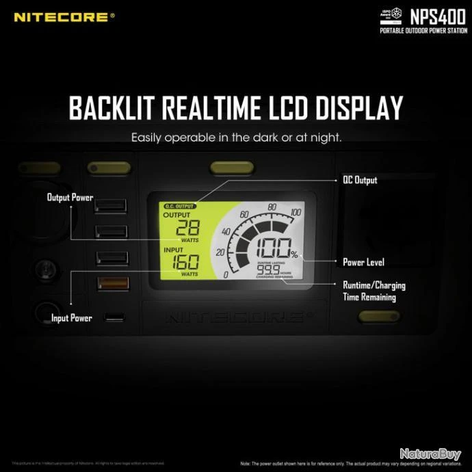 - Sortie USB type C : 5V-3A / 9V-3A / 12V-3A / 15V-3A / 20V-3A (60W max).