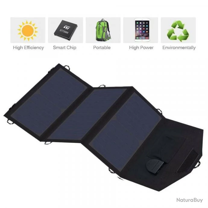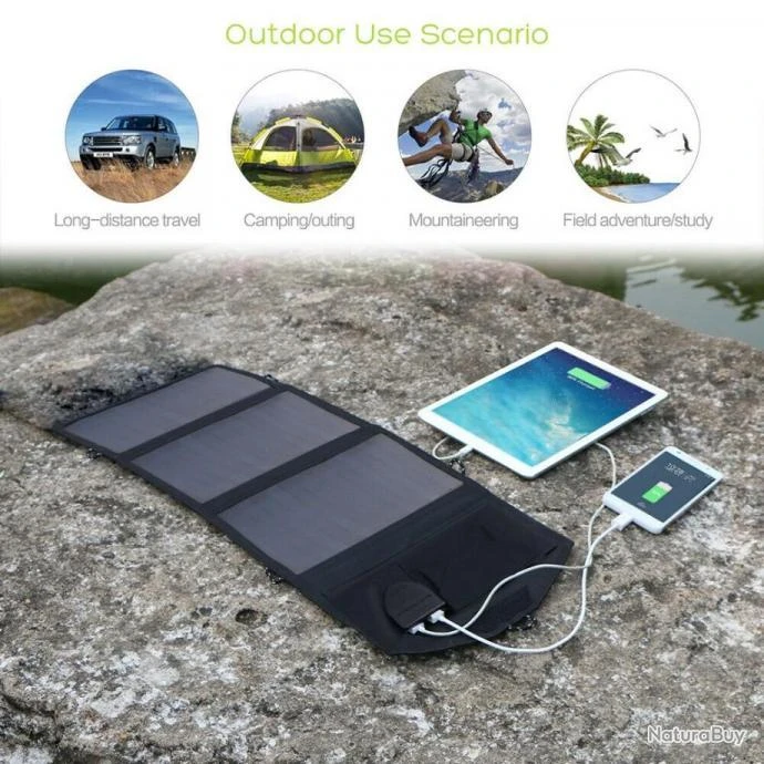 1. Veuillez vérifier le modèle, la taille, la tension et la puissance de votre adaptateur d’origine pour assurer la compatibilité avant utilisation. Veuillez fermer l’ordinateur portable avant de le charger, le panneau solaire est uniquement conçu en cas d’urgence, pas une source principale de charge pour l’ordinateur portable