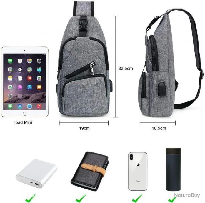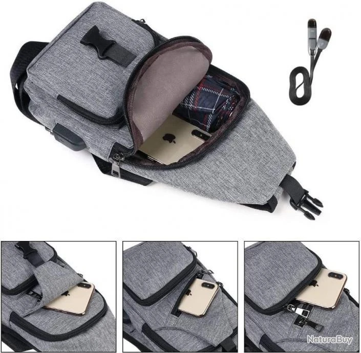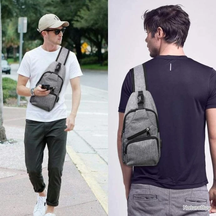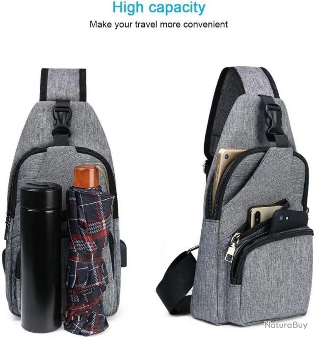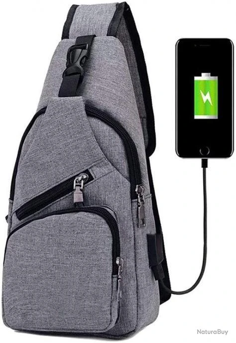 Sac à Dos Sacoche Homme Bandouliere Chargement USB Vélo Course Camping Pêche Randonnée Voyage Gris