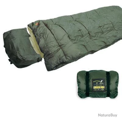 Sac de couchage pilot bag vert intérieur sableavec sacoche oreillerintégrée, garnissage polyester, tissu extérieuren nylon déperlant. Confort + 15 °C, limite confort + 11°C, extrême + 5°C. Poids : 1,500 kg . Dimensions cas de couchage déplié : 1.80 x 0.75 m. Dimensions housse de compression : diamètre 24 cm. Hauteur : 35 cm.