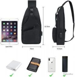Sacoche Homme à Bandouliere Sac à Dos Chargement USB Vélo Course Pêche Camping Randonnée Voyage Noir